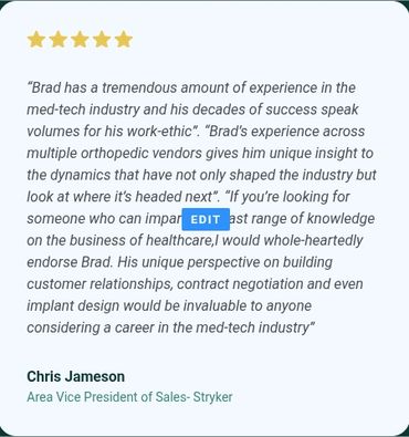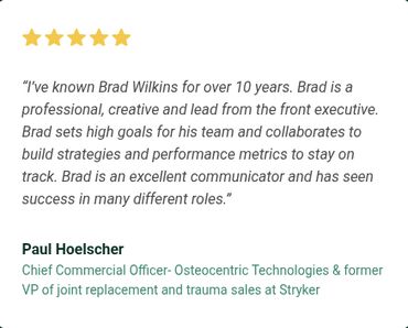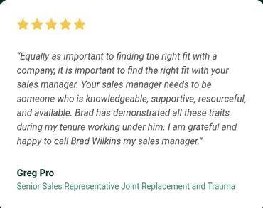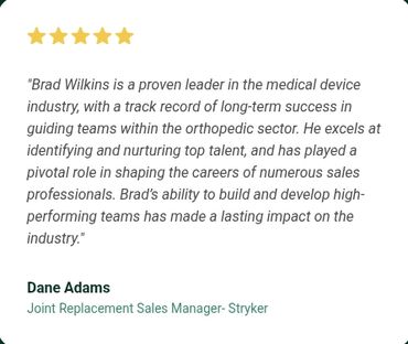Hi! I’m Brad Wilkins , I have built multi-million territories as a sales rep, led multi-state geographies with the 3 largest companies in the industry, and have been recognized as a #1 U.S. Manager. With 30+ years in medical device sales, I've interviewed hundreds of candidates, seeing firsthand what separates successful applicants from those who get rejected.